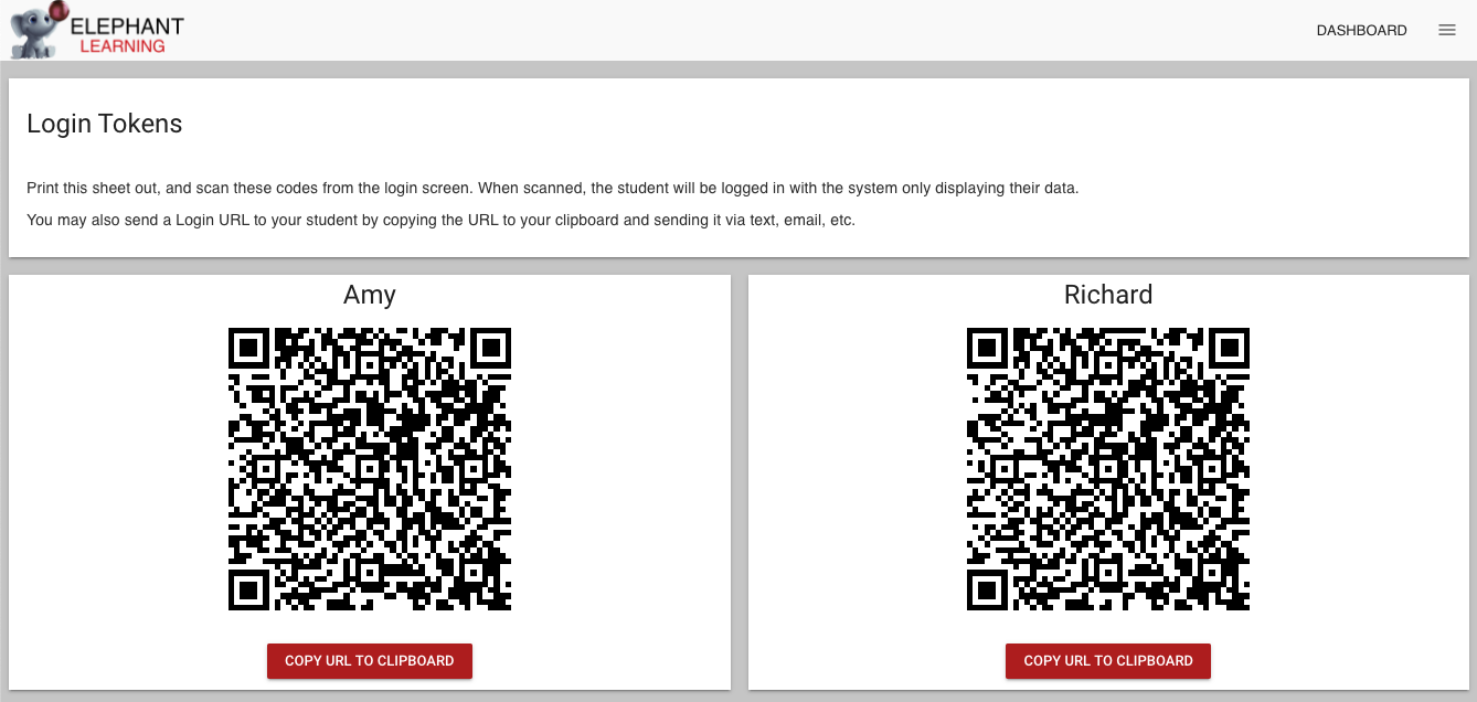 The QR Logins menu option allows you to print QR codes that your students can scan in order to quickly log in to Elephant Learning. This is particularly useful if you have younger students and/or multiple students using a single device to access the app.